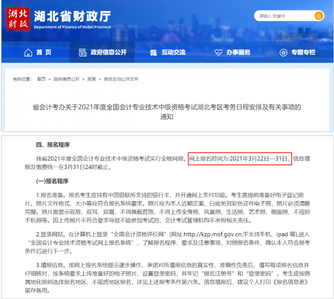 昨天湖北省發(fā)布了《省會(huì)計(jì)考辦關(guān)于2021年度全國(guó)會(huì)計(jì)專(zhuān)業(yè)技術(shù)中級(jí)資格考試湖北考區(qū)考務(wù)日程安排及有關(guān)事項(xiàng)的通知》,其中通知報(bào)名時(shí)間從2021年3月22日開(kāi)始,比官方公布的3月10日開(kāi)始推遲了12天。