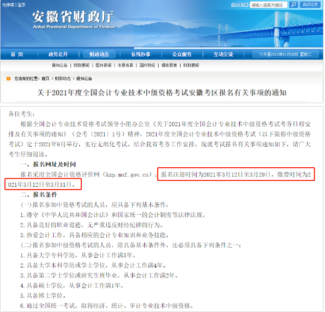 無(wú)獨(dú)有偶,昨天安徽省也公布了《關(guān)于2021年度全國(guó)會(huì)計(jì)專(zhuān)業(yè)技術(shù)中級(jí)資格考試安徽考區(qū)報(bào)名有關(guān)事項(xiàng)的通知》,報(bào)名時(shí)間從2021年3月12日開(kāi)始,比官方公布的時(shí)間推遲了2天。