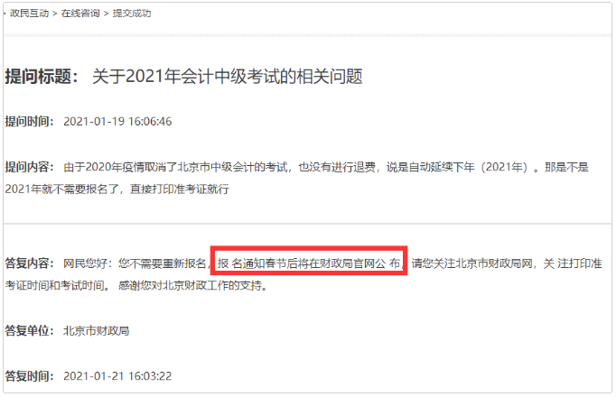北京市財(cái)政局最新答復(fù)內(nèi)容:您好:您不需要重新報(bào)名,報(bào)名通知春節(jié)后將在財(cái)政局官網(wǎng)公布,請(qǐng)您關(guān)注北京市財(cái)政局網(wǎng),關(guān) 注打印準(zhǔn)考證時(shí)間和考試時(shí)間。感謝您對(duì)北京財(cái)政工作的支持。