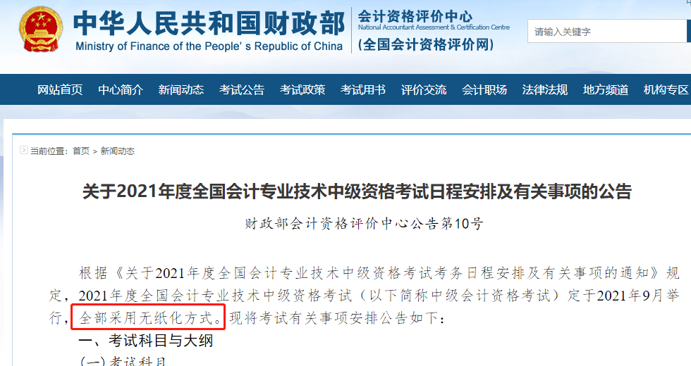 報(bào)名2021年中級(jí)會(huì)計(jì)職稱的考生請(qǐng)注意:財(cái)政部發(fā)布的《關(guān)于2021年度全國(guó)會(huì)計(jì)專業(yè)技術(shù)中級(jí)資格考試考務(wù)日程安排及有關(guān)事項(xiàng)的通知》中,明確指出2021年中級(jí)會(huì)計(jì)職稱考試采用無紙化考試方式!