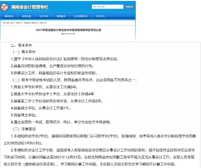 之前,湖南省財政廳發(fā)布了《2021年度全國會計專業(yè)技術(shù)中級資格湖南考區(qū)考試公告》,通知中表示取得函授、自考等成人類非全日制后續(xù)學歷的截止時間為2021年9月3日。