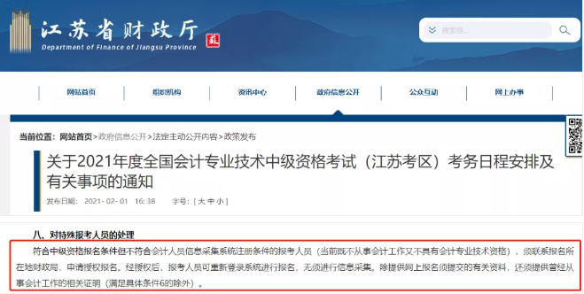 江蘇省財政廳在公布2021年中級報名簡章時,新加了一條對特殊報考人員的處理,一起來看下原文內(nèi)容(節(jié)選)。