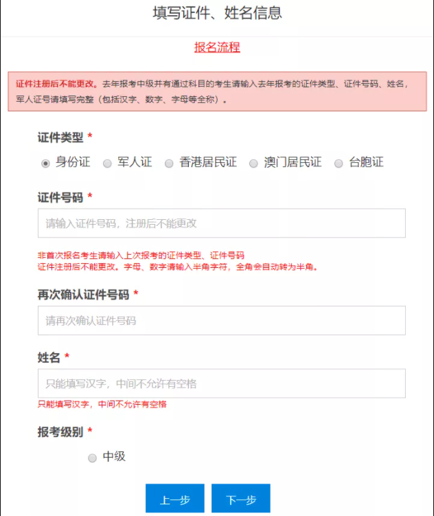 8、填寫個人證件號碼、姓名信息和報考級別,點擊下一步。